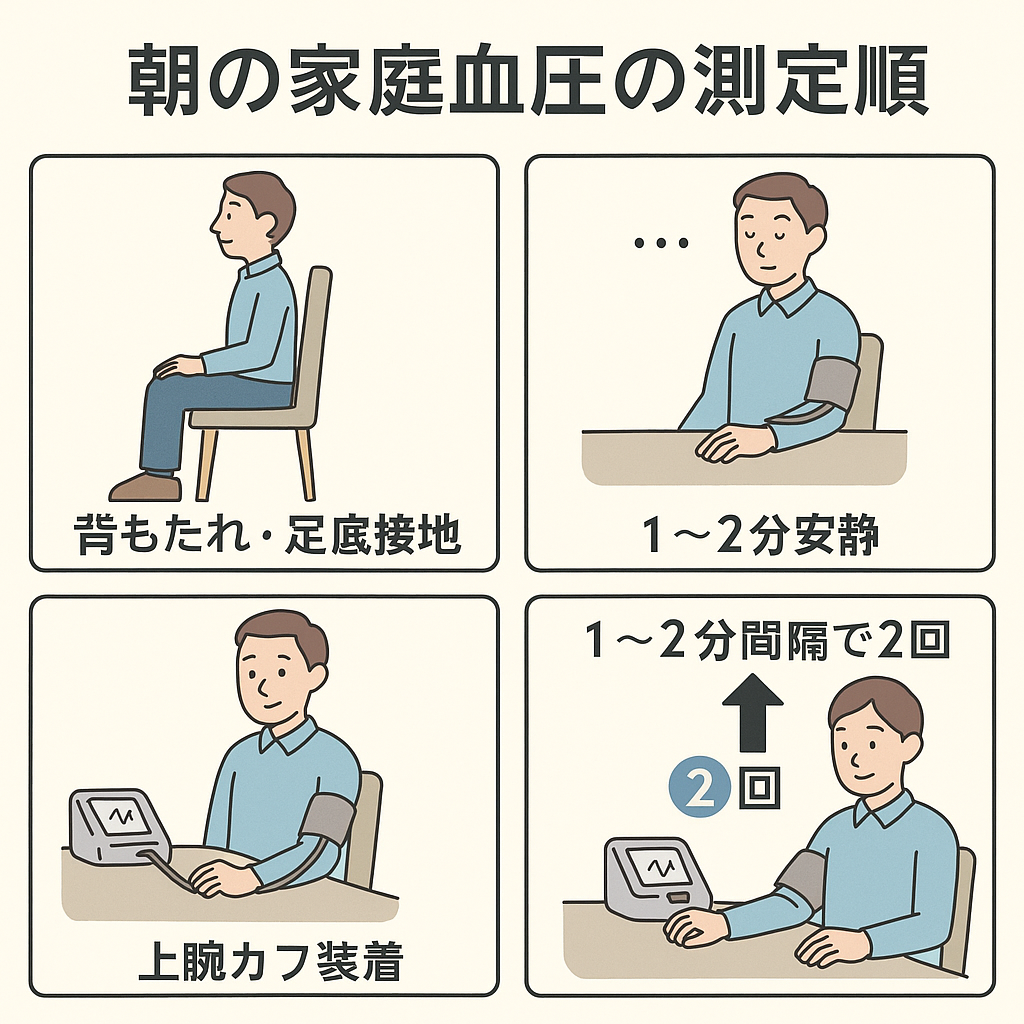 ※朝の測定ウィンドウ管理:起床後1時間以内/排尿後/服薬前/朝食前に、背もたれ・足底接地の座位で5分安静→1–2分間隔で2回測定。夜は就寝前に同様。これを7日間行い、朝晩それぞれの平均値で評価。