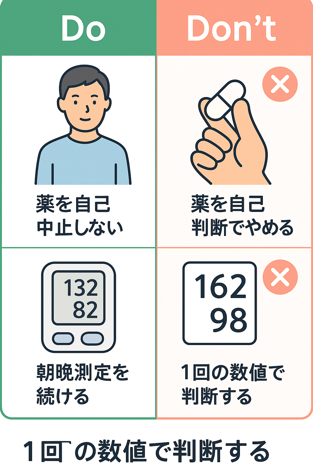 血圧が少し下がってくると、「薬を飲まなくてもいいのでは?」と思う方も少なくありません。ですが、これは大きな誤解です。薬によって血圧が安定している状態を「治った」と勘違いしてしまうケースが多いのです。実際には、薬を自己判断でやめてしまうと数値が再び上がり、脳卒中や心筋梗塞のリスクを高める危険性があります。薬はあくまで「血圧をコントロールするための支え」であり、生活習慣の改善と並行して継続することが安全です。
