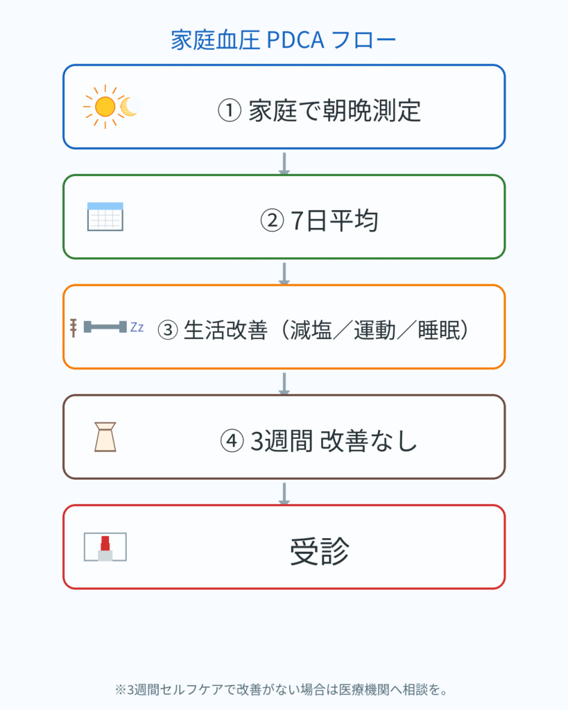 夜は就寝前に同じように測ります。これを**1週間(朝晩2回×7日=28回)**続けると、医師が判断に使える「週平均値」が手に入ります。単発の高い数字に一喜一憂せず、流れを捉えることが大切です。