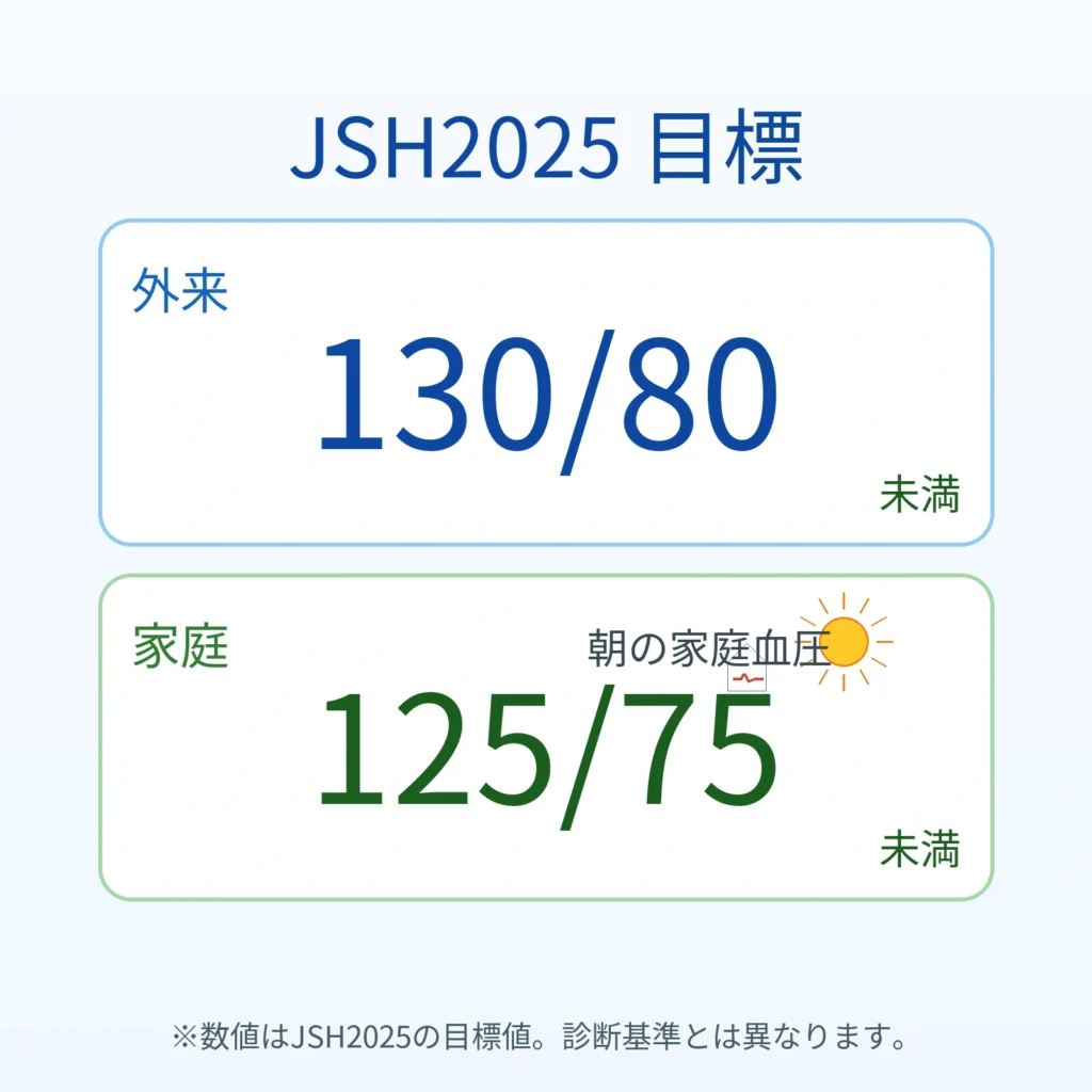 ※JSH2025は診断分類はJSH2019から変更なし。一方で治療目標は外来<130/80、家庭<125/75へ統一。