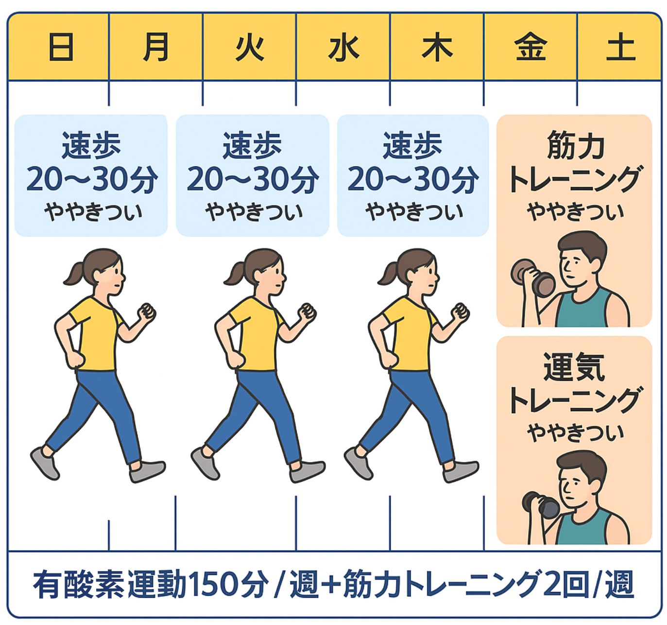 WellTakaの視点:リハビリ現場では「有酸素7割・筋トレ3割」の割合をおすすめしています。呼吸が苦しくならない強度(会話ができる程度)から始めるのが、継続の第一歩です。